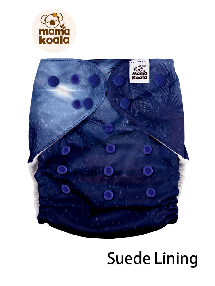 Mama Koala 3.0 cloth diapers are designed to fit babies of all shapes and sizes, with 3x4 rise snaps and cross-over multiple waist snaps adjusting to fit 8-40lbs. That is one size that fits from birth to potty training. Waterproof and breathable TPU outer, improved design of tummy panel for stomach sleepers to "help" with leaks & accidents, super soft and stay dry athletic wicking jersey / Suede CLoth inner protects baby from moisture. The polyester diaper is less bulky under clothing and it is very quick drying.